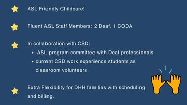Our facilities are designed to provide a comfortable and safe environment for children to learn and play. We have age-appropriate toys, books, and equipment, as well as outdoor play areas and a nutritious snack time twice a day.