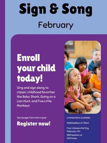 Wednesdays 10:00-10:30, Enjoy a 30 minute session with speech language pathologist Caitlin Giammona as we sign and sing some childhood favorites like Baby Shark, Going on a Lion Hunt, and more! Families who sign up for the full session will receive a discount at $80/4 classes. Single sessions are also available for sign up f